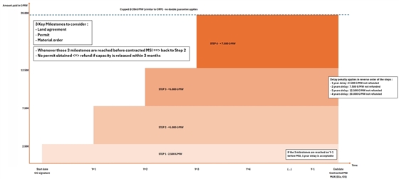 Als garantie voor deze voorwaarden stelt Elia een bankgarantie of waarborg voor. Er worden boetes voorzien indien de 3 voorwaarden niet vervuld zijn in het jaar volgend op de ondertekening van het aansluitingscontract. Deze boetes worden bepaald per MW aangevraagd vermogen, starten met 2.500 €/MW na het eerste jaar en oplopend tot 7.500 €/MW na het 4de jaar zonder de 3 voldane voorwaarden.
